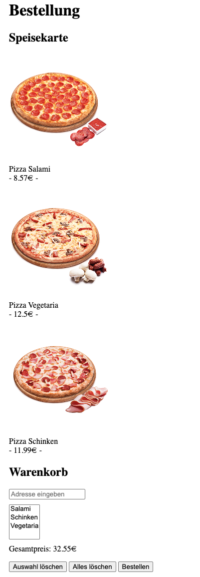 Bestellseitemit HTML5 (Die übrigen Seiten müssen Sie noch nicht implementieren). Die Seite ist statisch und zeigt lediglich die verschiedenen HTML-Elemente an. Funktionen wie die Pizza anzuklicken, Preise berechnen, Datenbankanbindung o.ä. werden erst in späteren Praktikumsterminen ergänzt. Da Sie noch kein CSS verwenden (sollen), sollte die Seite ungefähr so aussehen wie in der Beispielausgabe -